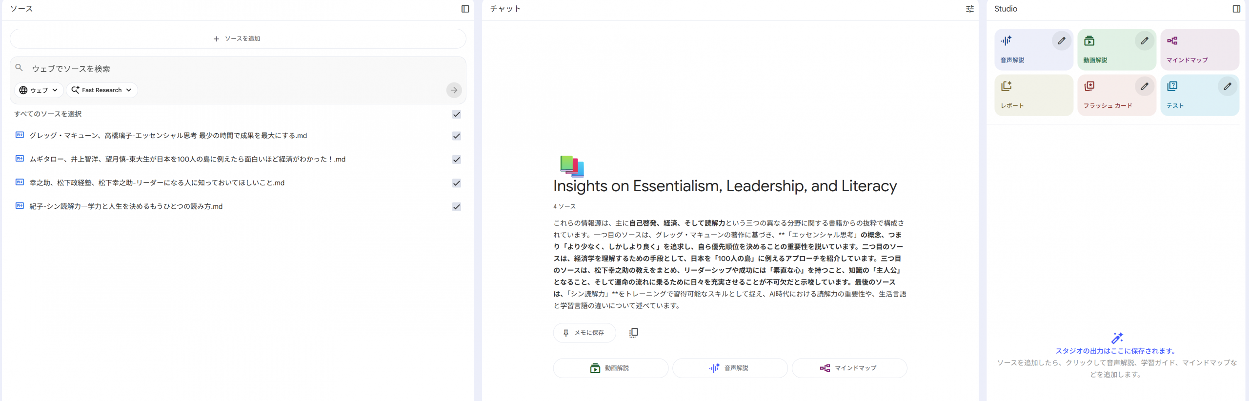 という流れを構築することできるということと、NotebookLMでアウトプット内容を支援してもらうことができるということなので、実際に導入してみました!
