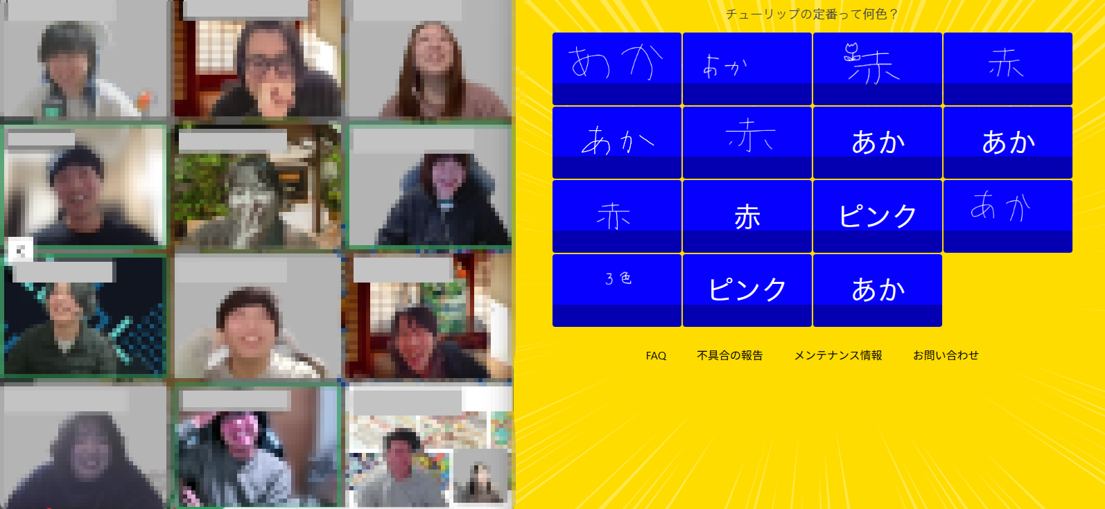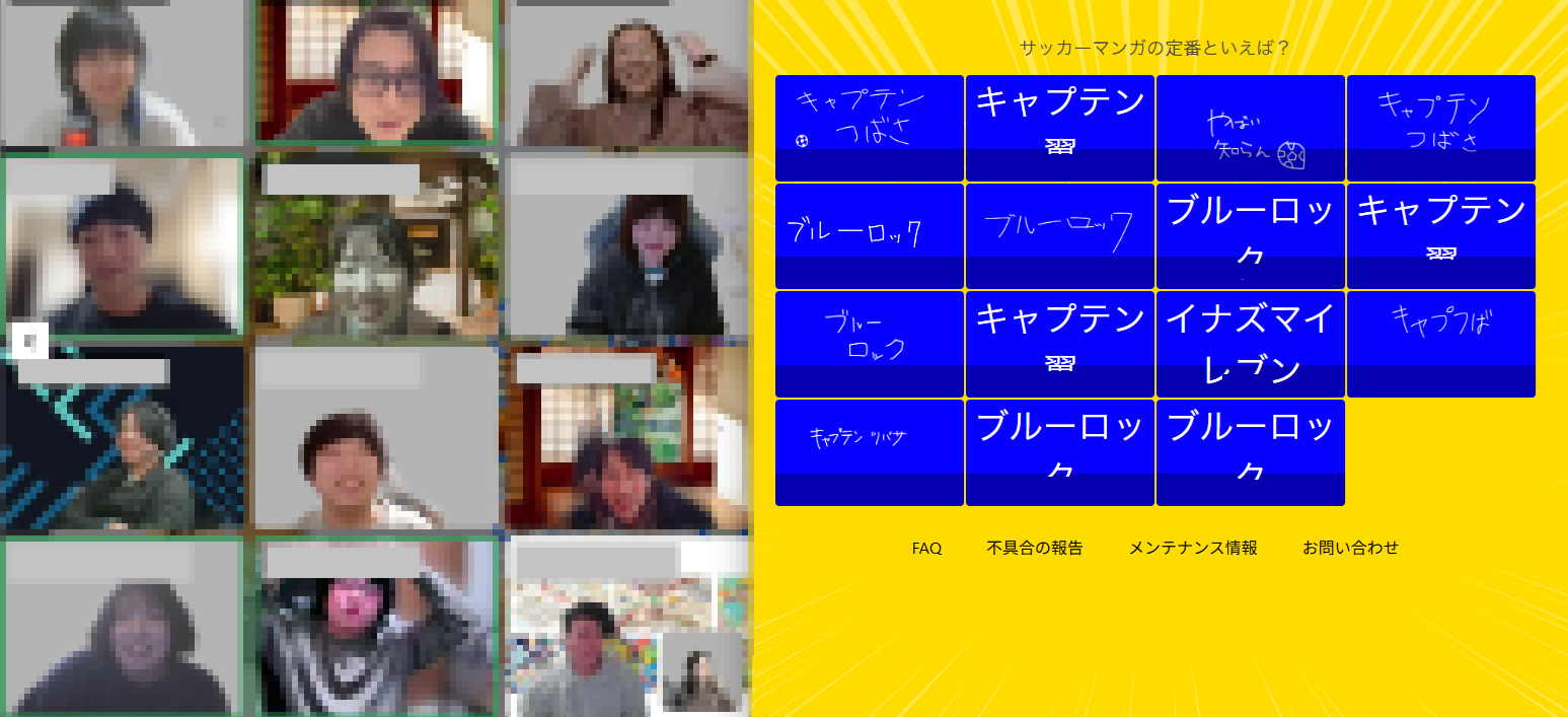 一致するまで終われまテンは、オンライン会議ツール(Zoomなど)を使って大喜利や意思疎通を楽しむ参加型ゲームです。